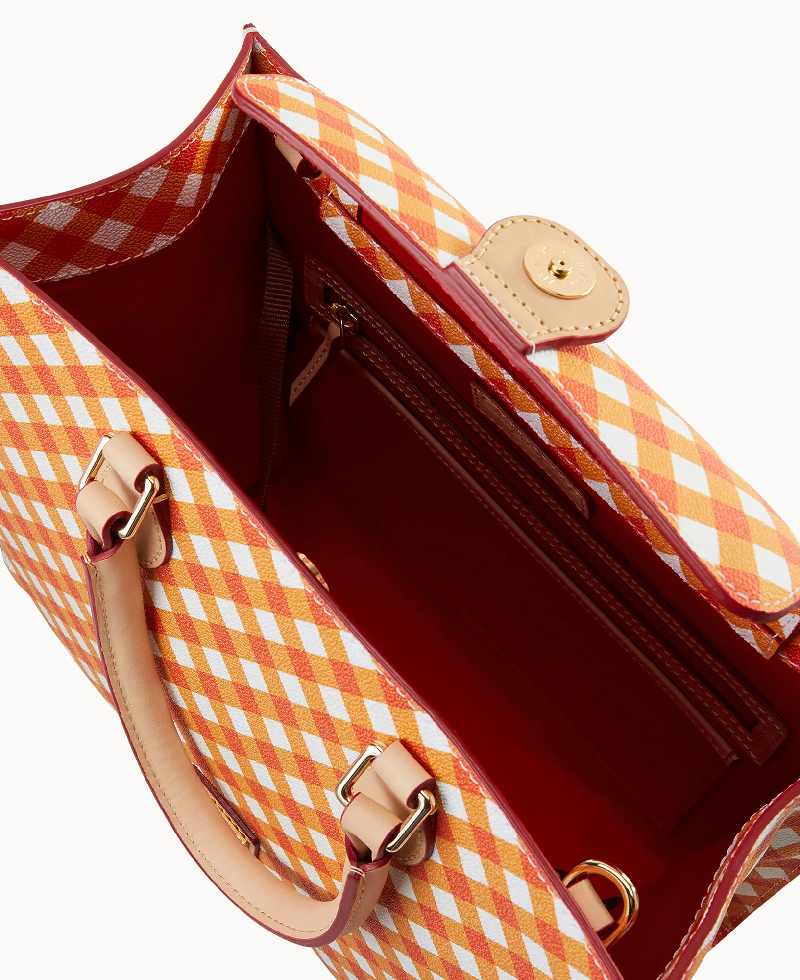 One inside zip pocket. Two inside pockets. Cell phone pocket. Inside key hook. Adjustable, detachable shoulder strap. Strap drop length 10". Magnetic snap flap closure.