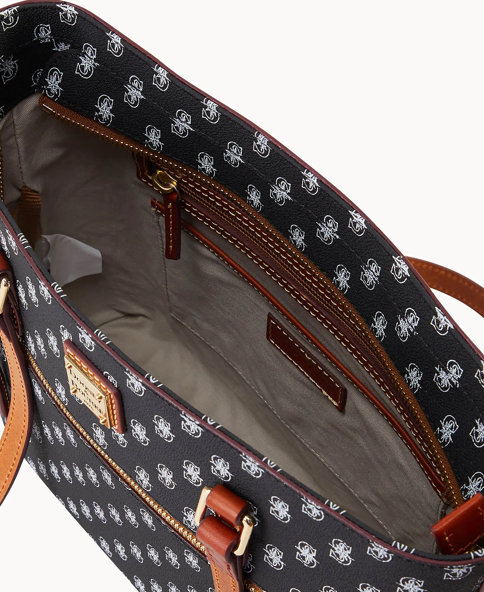 One outside zip pocket. One inside zip pocket. Two inside pockets. Cell phone pocket. Inside key hook. Strap drop length 11.5". Feet. Zipper closure.